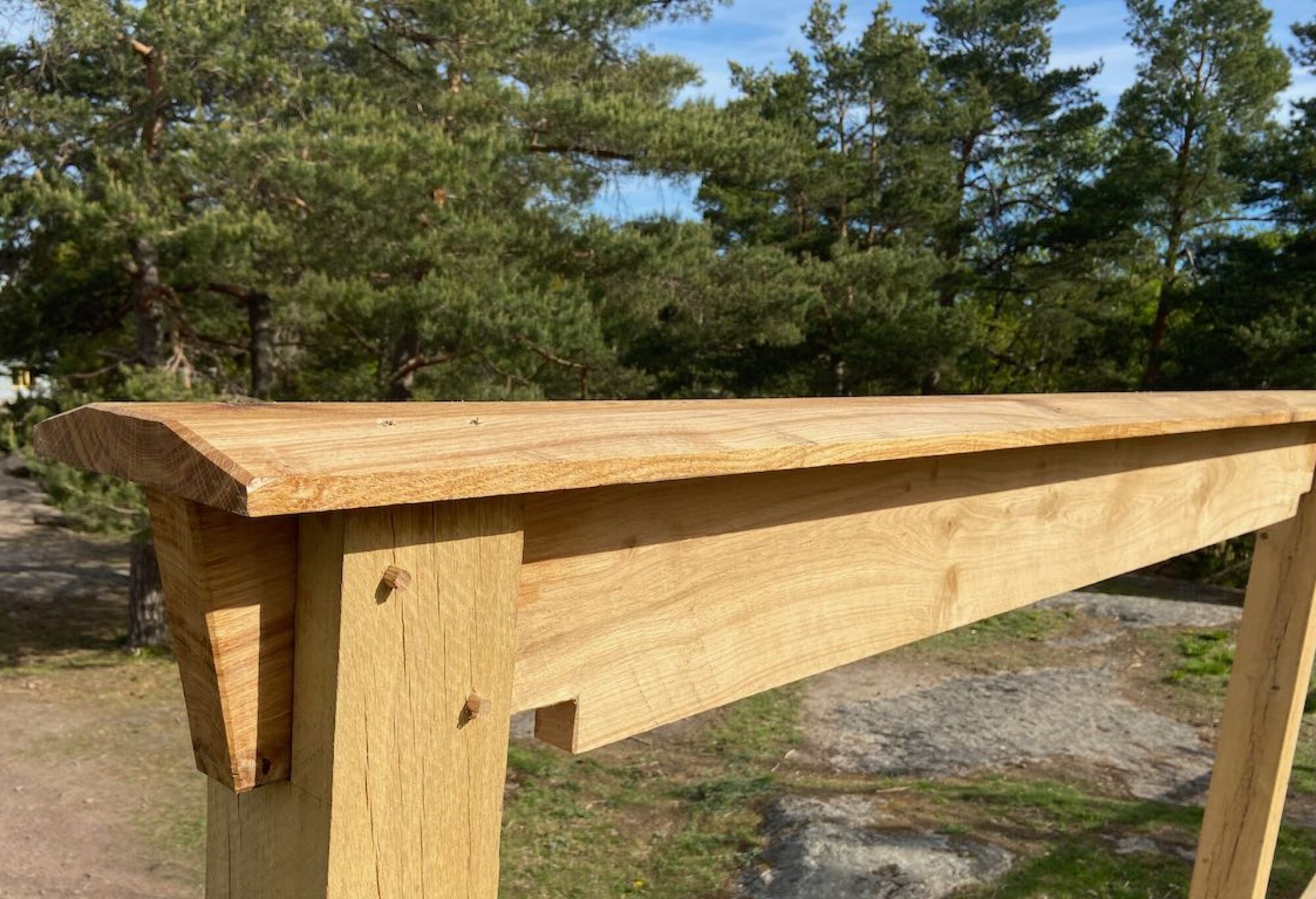 Här en intressant detalj på kunnigt byggande från förr gällande avbäring ovanför fönster. Den snesågade liggande plankan vilar på en liten klack i den stående intilliggande plankan. Denna lilla klack bär hela lasten ovanför fönstret. Och med tanke på att huset är över 10 m upp till nock så är det fascinerande vad starkt trä är om man använder det rätt.