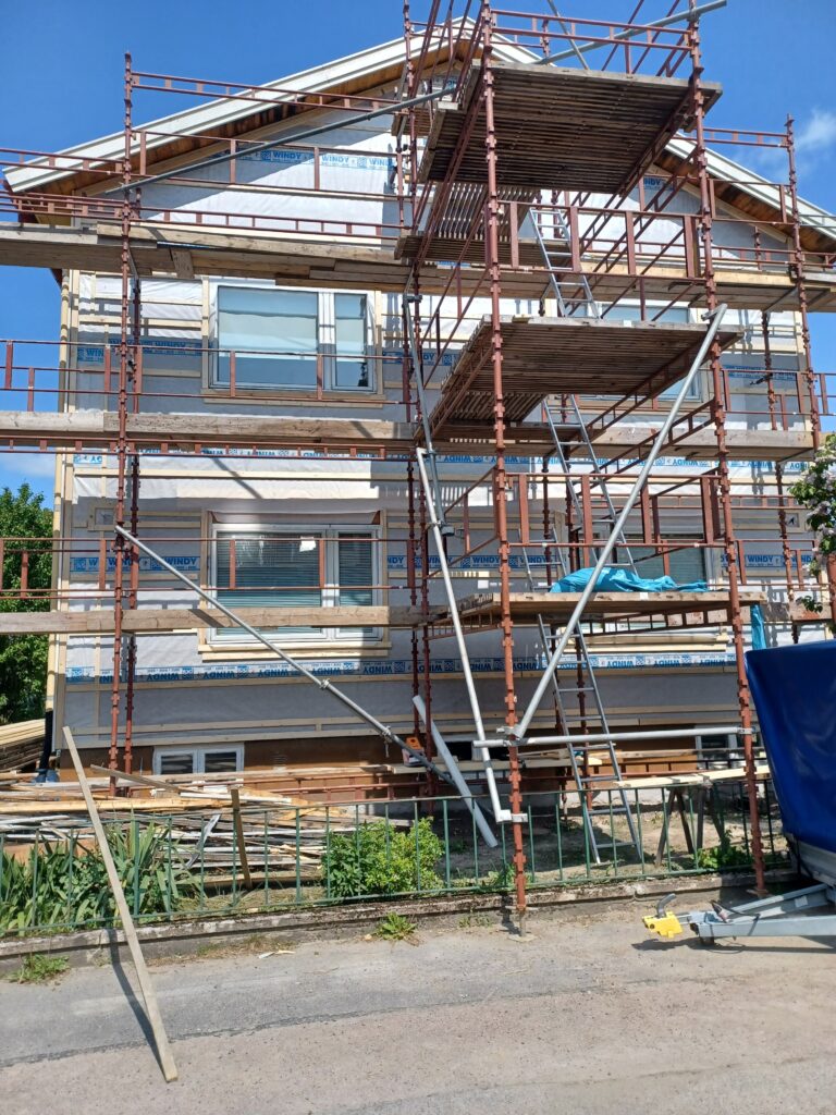 Efter Huntonskivor är det dags för vindduk. Vinddukens funktion är som namnet skvallrar om till för att stänga ute vind och drag in i huset. Så lite onödigt med tanke på Huntonskivorna kan tyckas. Men då slipper vi tejpa Huntonskivornas skarvar och dessutom tror vi inte på den där tejpen. Det sägs att den skall hålla i 50 år. Men hur vet man det? Det var bara några år sedan den började användas. Dessutom bygger vi för att det skall hålla längre än 50 år. Huset är byggt tidigt 40-tal. Det är alltså redan minst 80 år och bakom fasaden är det i perfekt skick.