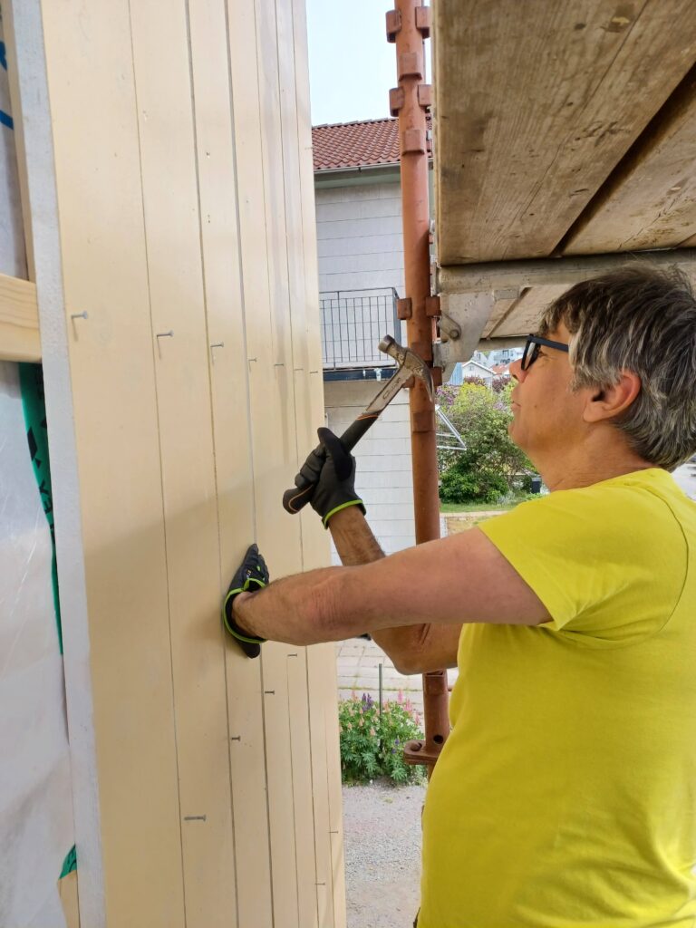 Panelen är nu klar och alla fönster bytta. Dags för lockläkt. Det är lockläkten som håller panelen på plats och spikas med 4-tum. Förborras för att minska sprickbildning. Panelen hänger med rätt så få 3-tum spik. Vi undviker att spika för mycket i panelen för att minska spänningarna i virket. I detta fall spikas panelen i varannan spikläkt, dvs på cc 120 cm. Medan lockläkten spikas i varje regel.