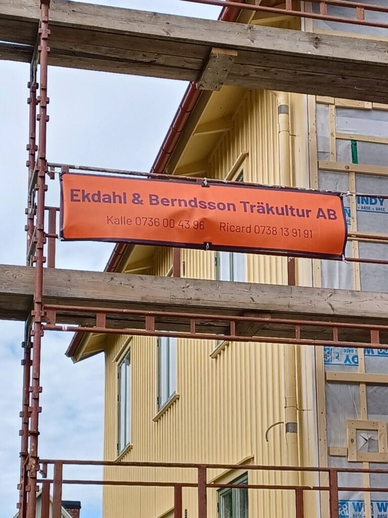Vår banderoll med västerfasaden vi bytte i vintras samt söderfasaden vi arbetar med nu i bakgrunden.