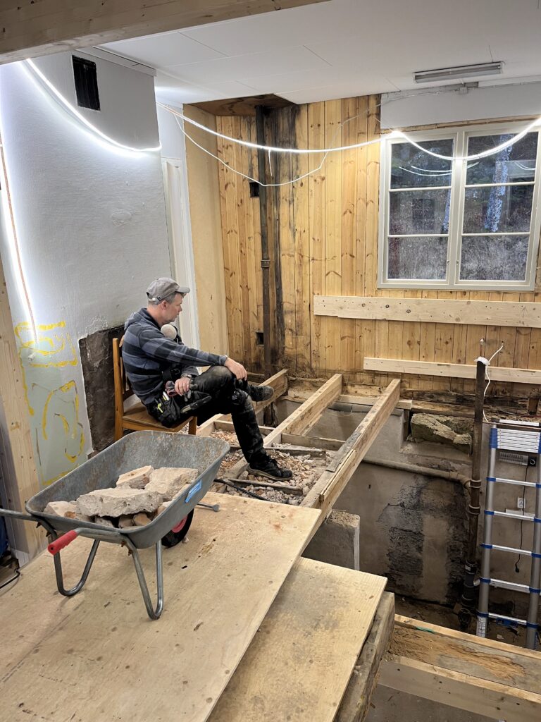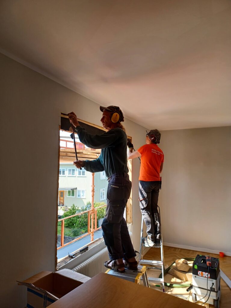 Anders och Ricard i färd med att inifrån göra fönsterhålet större.