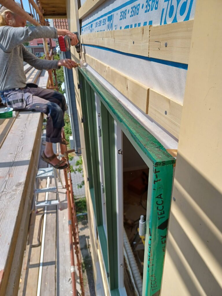 Härligt att få avsluta veckan med att avsluta ett kapitel: vindduken satt och all spikläkt, gran 28×70, är satt. På måndag börjar vi panela med breda fina furubrädor från såg i Värmland, grund och mellanstrukna med Wibo linoljefärg