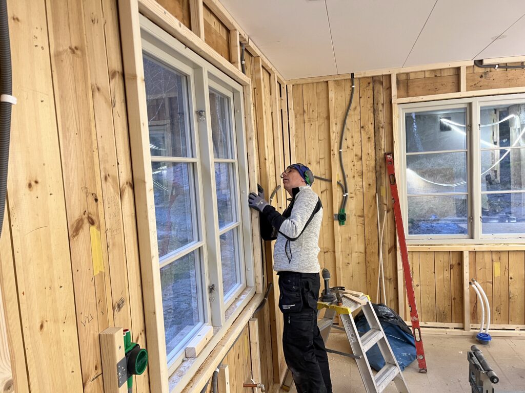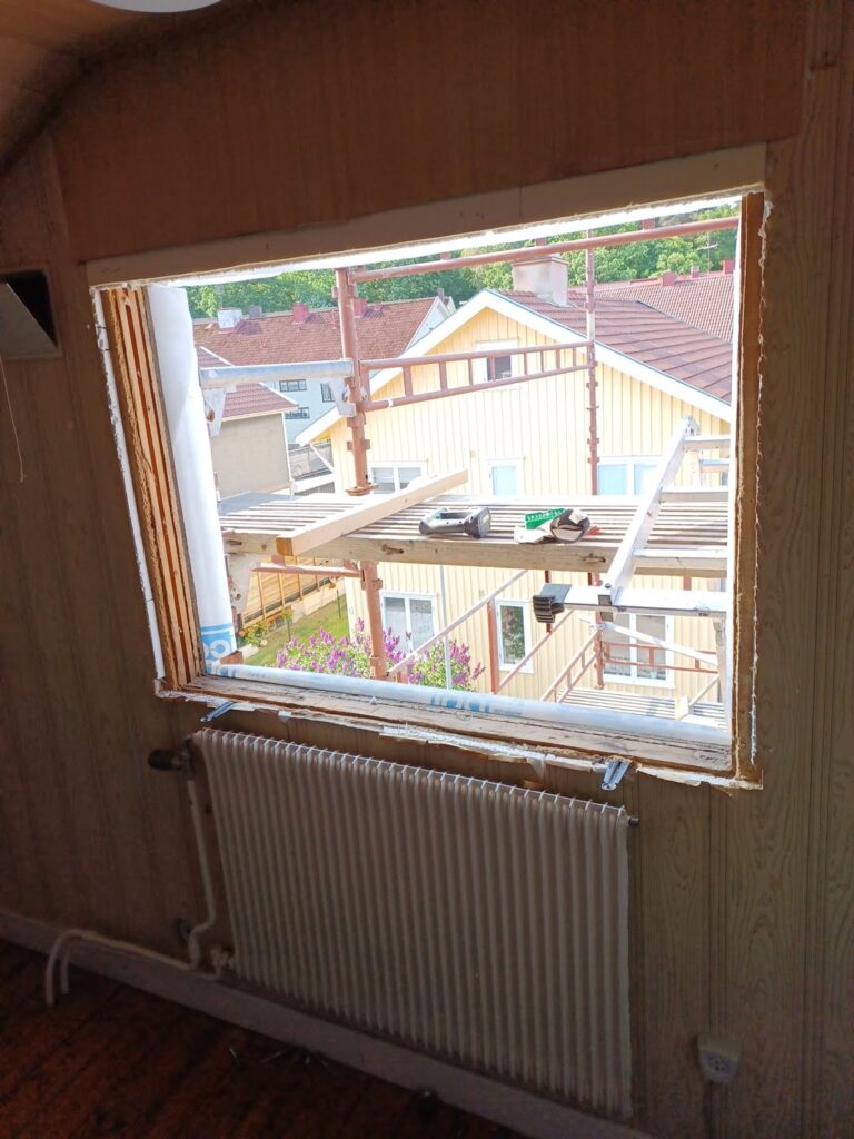 Fönstret är ute och väggen är avlastad med 45×220 regel eftersom de nya fönstren som skall in är större än de som satt och därför har vi sågat bort den tidigare bärande konstruktionen.