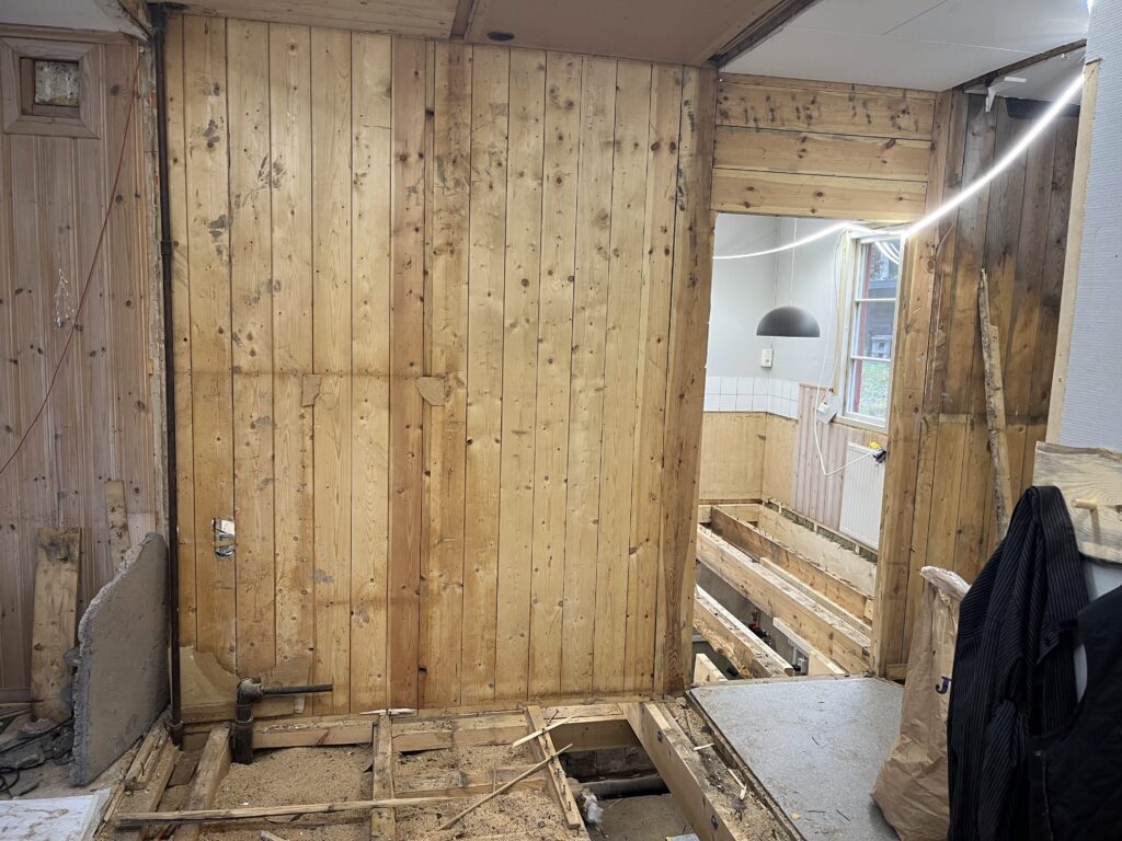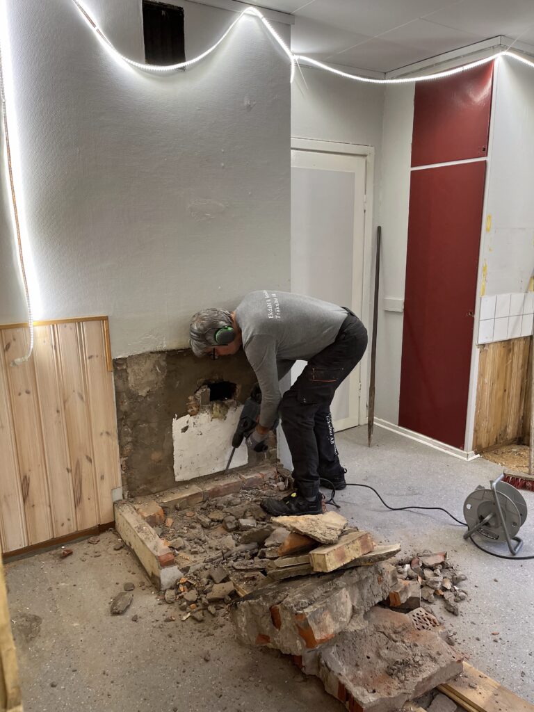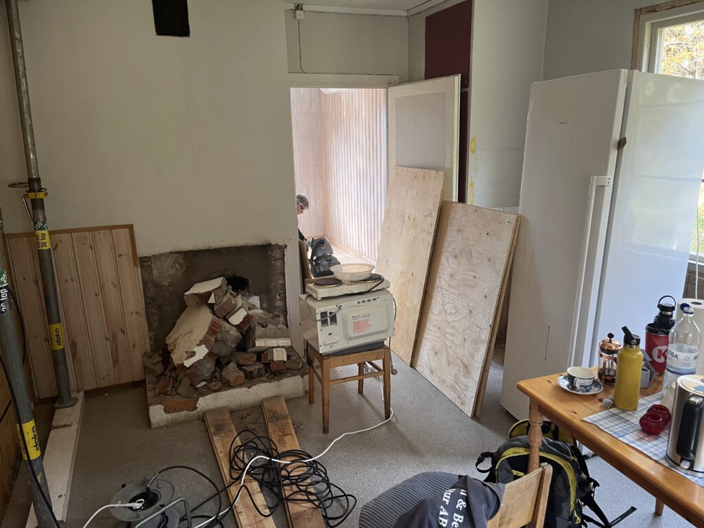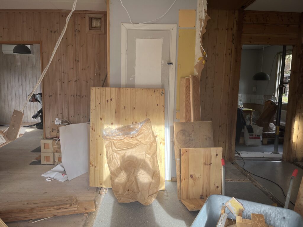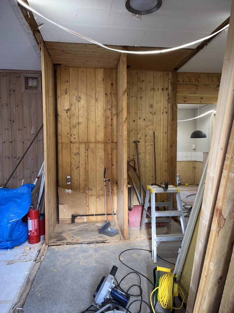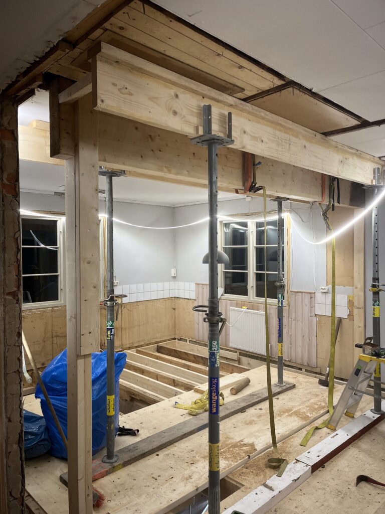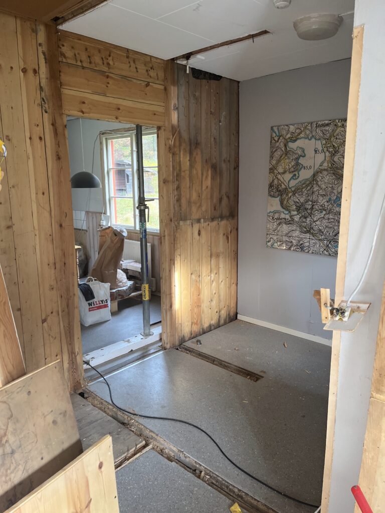 hela den bärande mellanväggen är riven. Vindsbjälklaget bärs nu upp av en limträbalk enl konstruktörens anvisningar.