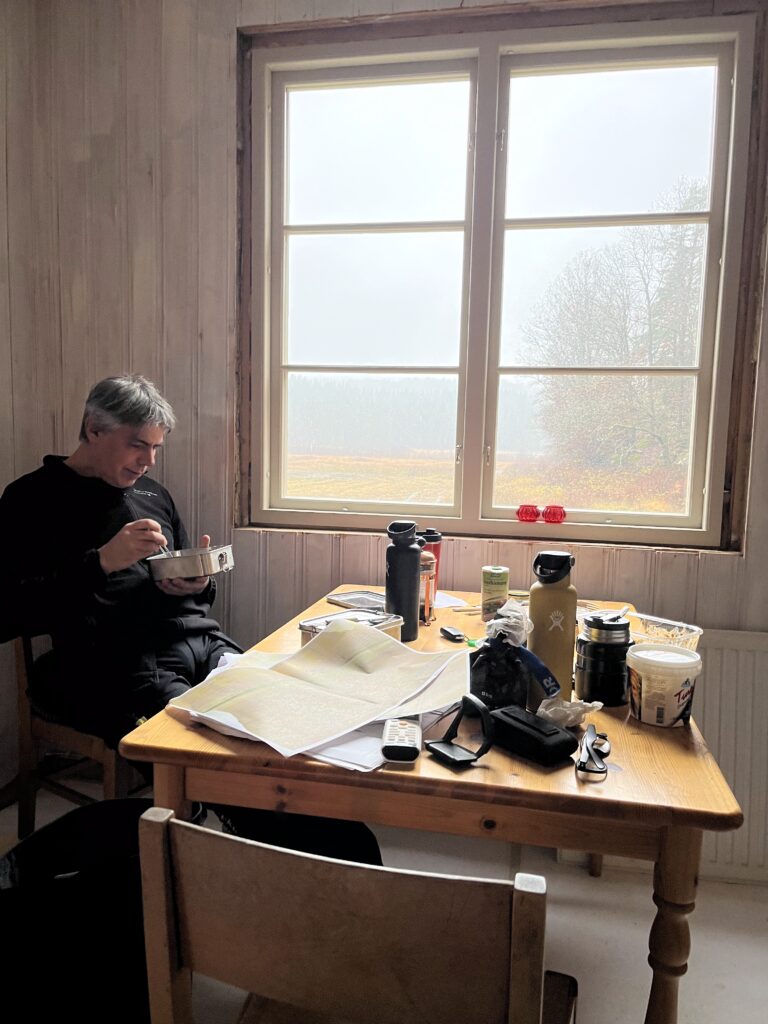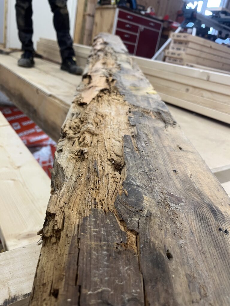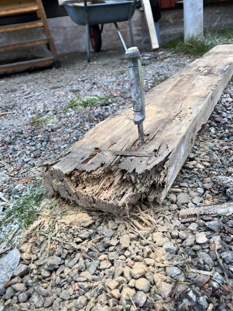 Reflekterar över sakernas tillstånd mot slutet av förra veckan. Till höger i bild syns rötskada i syll som blir nästa veckas första prioritering.