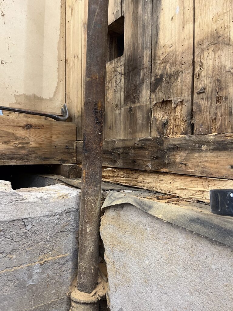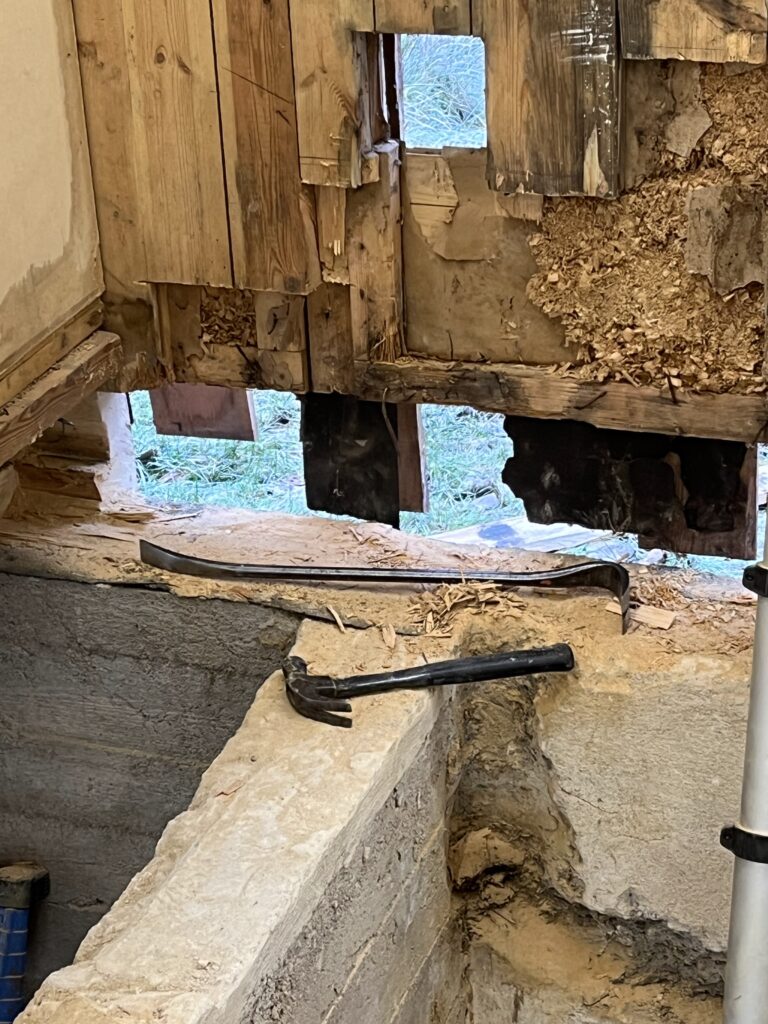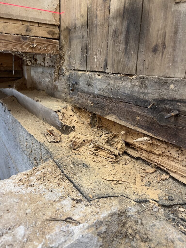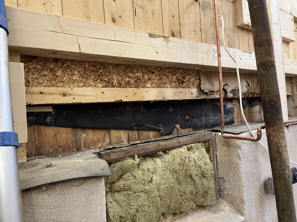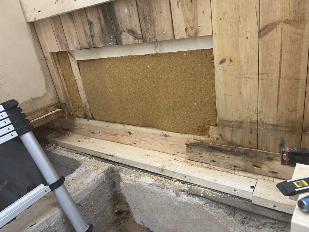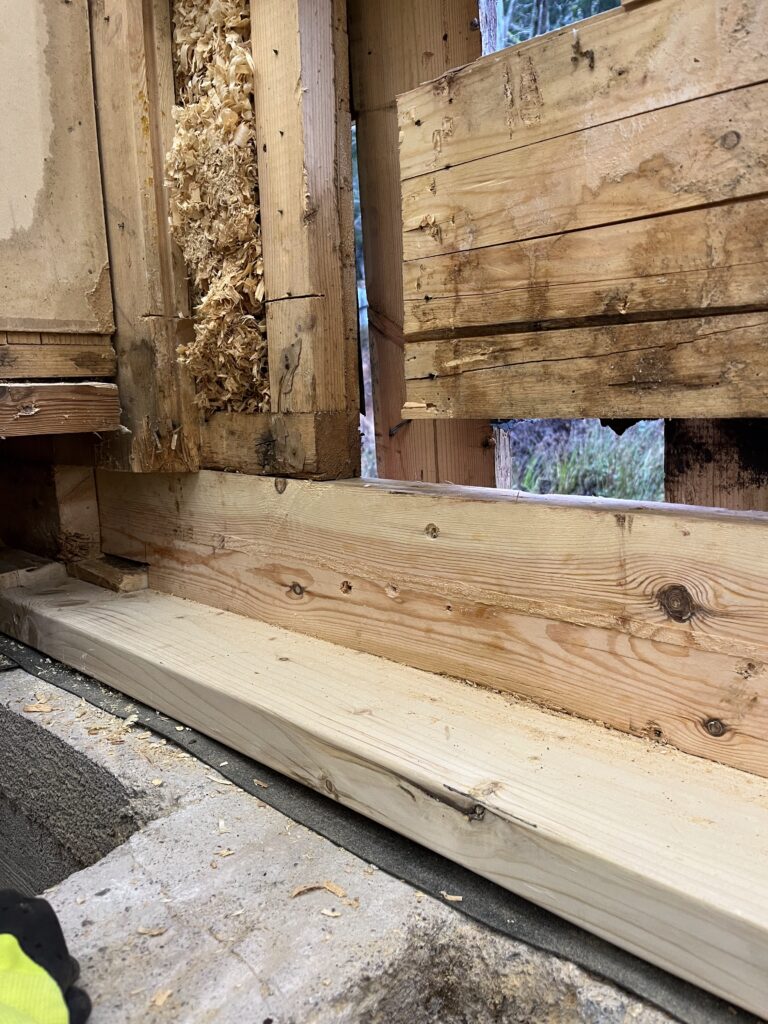 Den rötskadade syllen är borttagen. Bakom syns ytterpanelen. Som på äldre hus saknas ofta luftspalt. Anledningen till rötskadan är sannolikt vattenläcka inifrån.