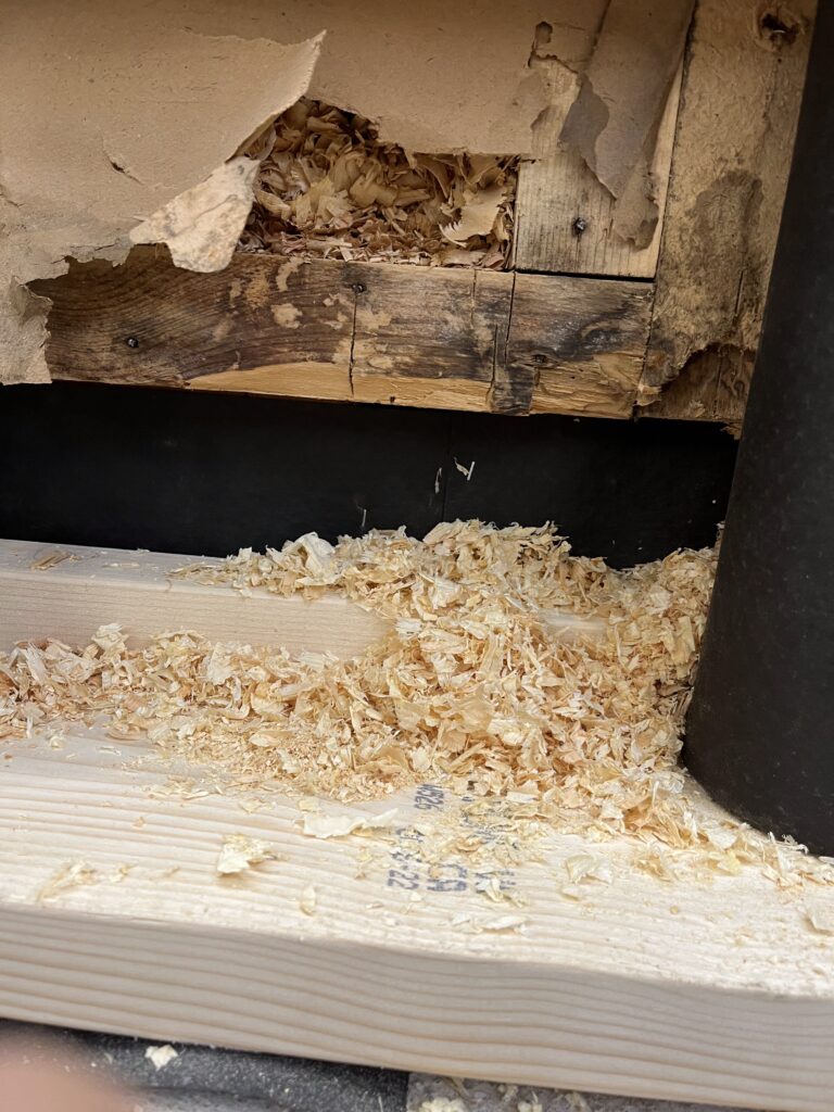 En ny rötskada upptäckt. Förmodligen orsakad av vatten som tagit sig in via taket och runnit längs med avluftingsröret. Tidigare stod här ett ventilerat skafferi vilket gjort att skadan ej upptäckts och förmodligen skyndat på rötprocessen då varm luft från köket fällt sin fukt i det kallare skafferiet.