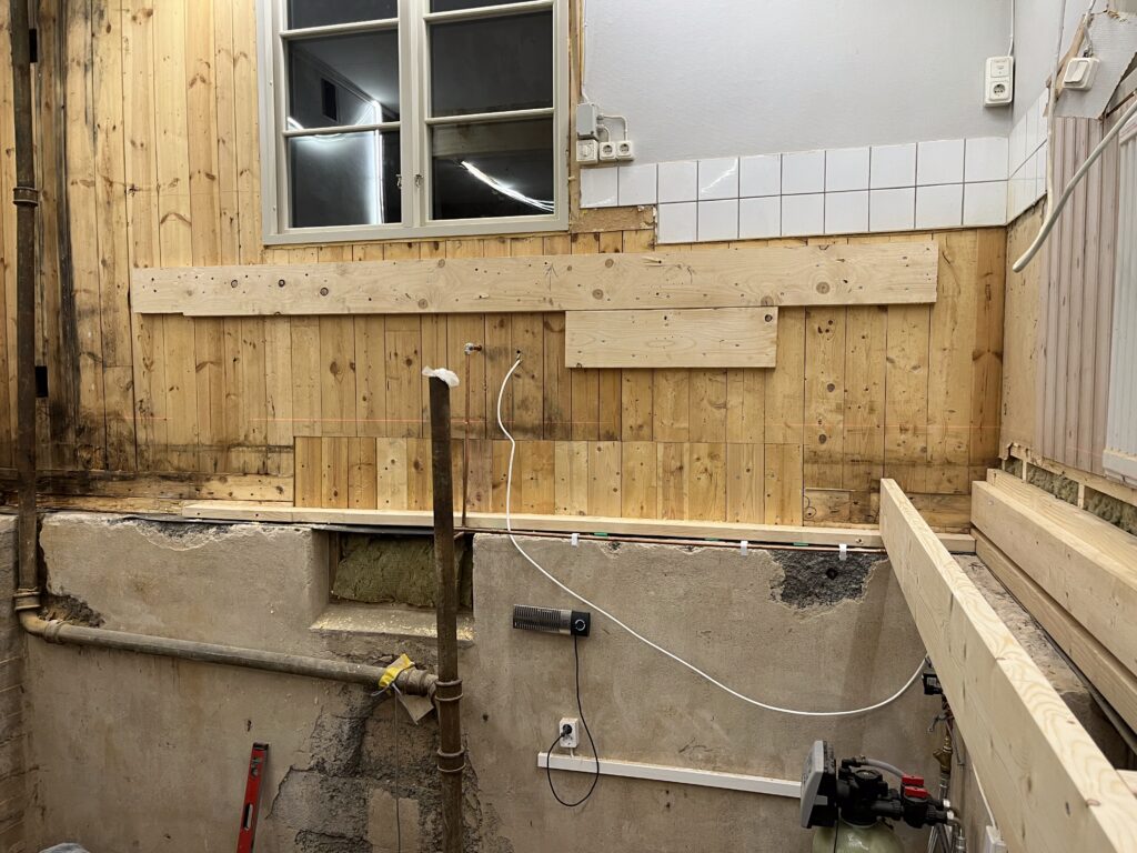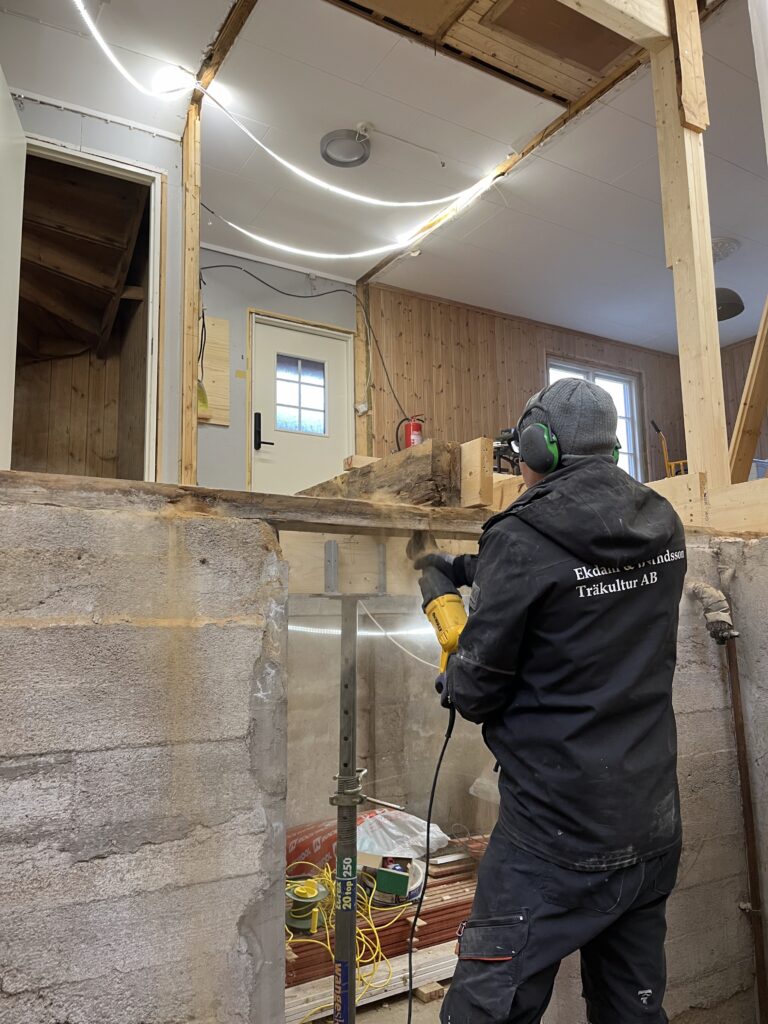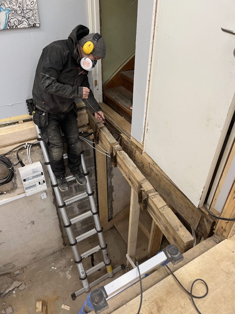 Den nya väggen börjar ta form. Även denna gång använder vi material från en mellanvägg. Det är samma dimension som den rötskadade yttervägg vi rivit.