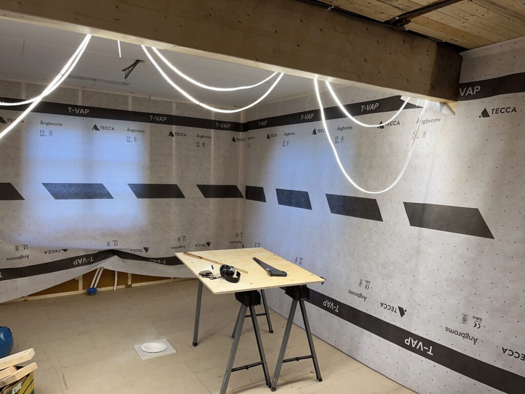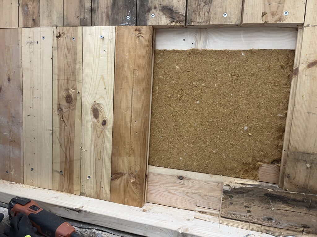 Nya spikreglar och ny Hunton träfiberisolering. Utsidan har fått ny vindpapp.